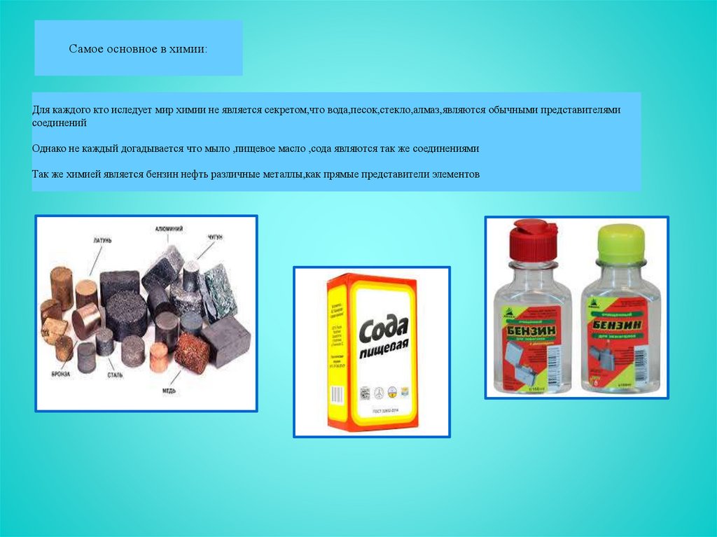 Так же химией является бензин нефть различные металлы,как прямые представители элементов