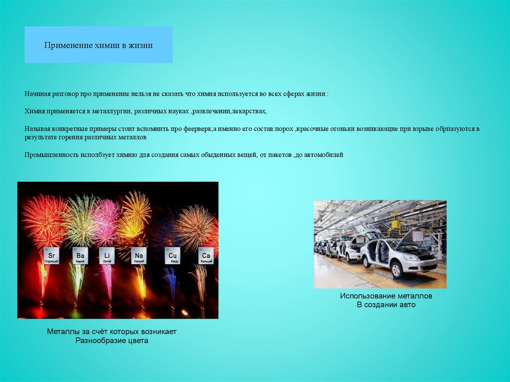 Химия применяется в металлургии, различных науках ,развлечении,лекарствах,