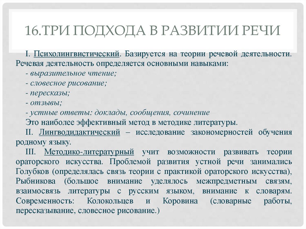 16.ТРИ ПОДХОДА В РАЗВИТИИ РЕЧИI. Психолингвистический. Базируется на теории речевой деятельности.