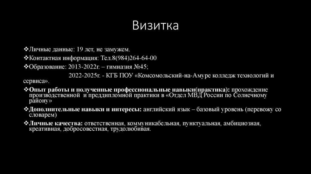 ВизиткаЛичные данные: 19 лет, не замужем.