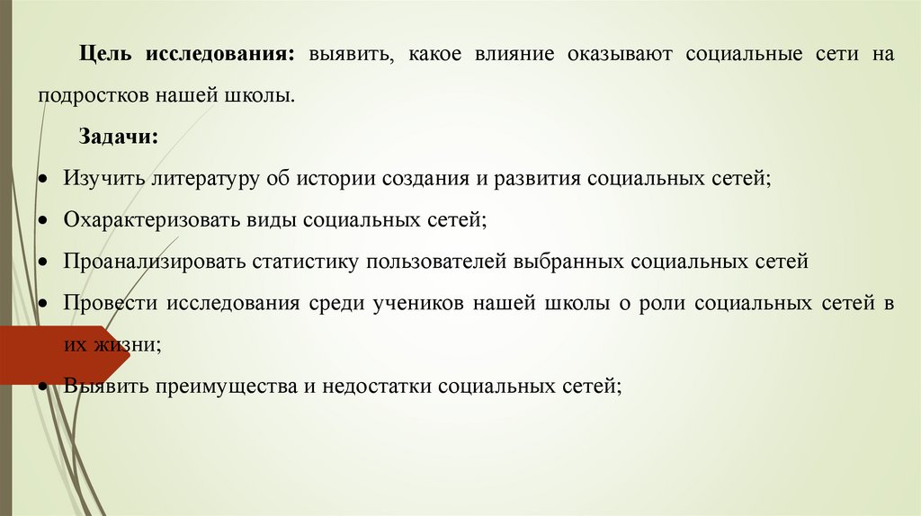 Цель исследования: выявить, какое влияние оказывают социальные сети наподростков нашей школы.