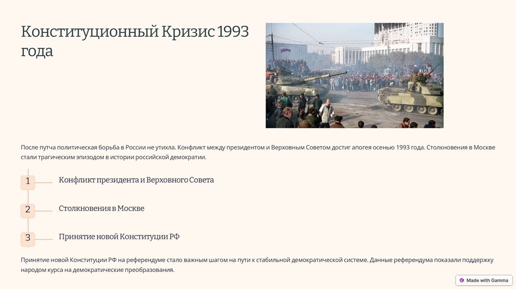 После путча политическая борьба в России не утихла. Конфликт между президентом и Верховным Советом достиг апогея осенью 1993 года. Столкновения в Москве