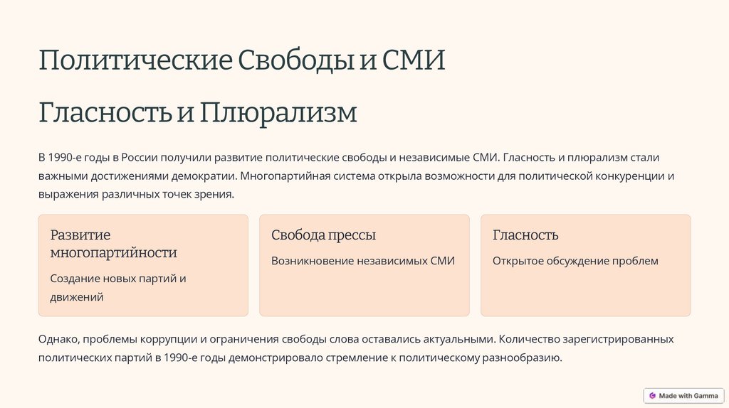 В 1990-е годы в России получили развитие политические свободы и независимые СМИ. Гласность и плюрализм стали