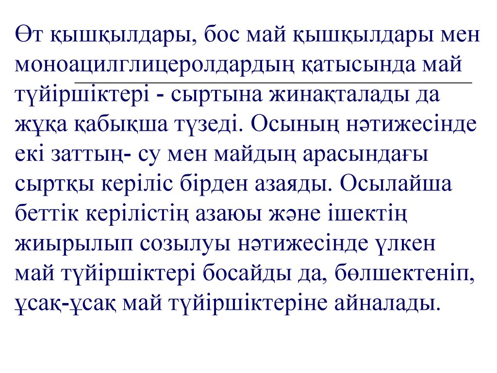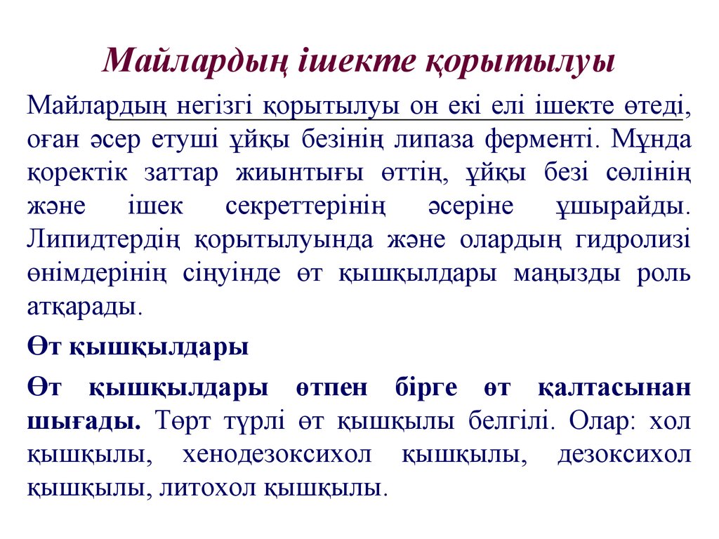 Майлардың ішекте қорытылуыМайлардың негізгі қорытылуы он екі елі ішекте өтеді,