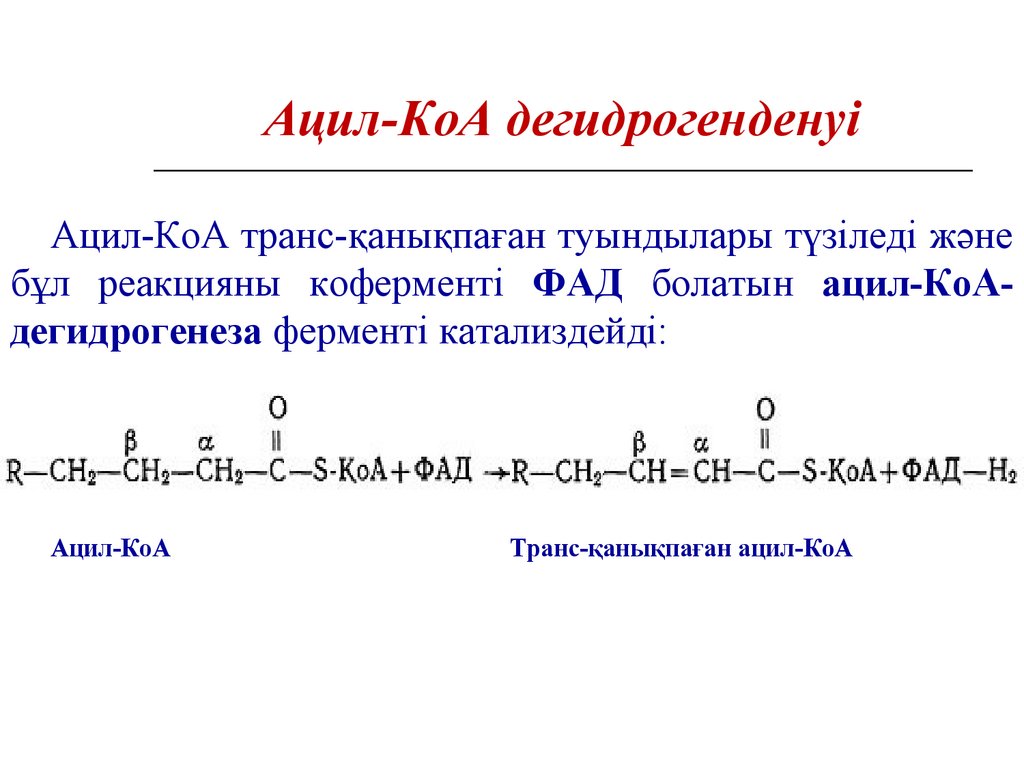 Ацил-КоА транс-қанықпаған туындылары түзіледі жәнебұл реакцияны коферменті ФАД болатын ацил-КоАдегидрогенеза ферменті катализдейді:
