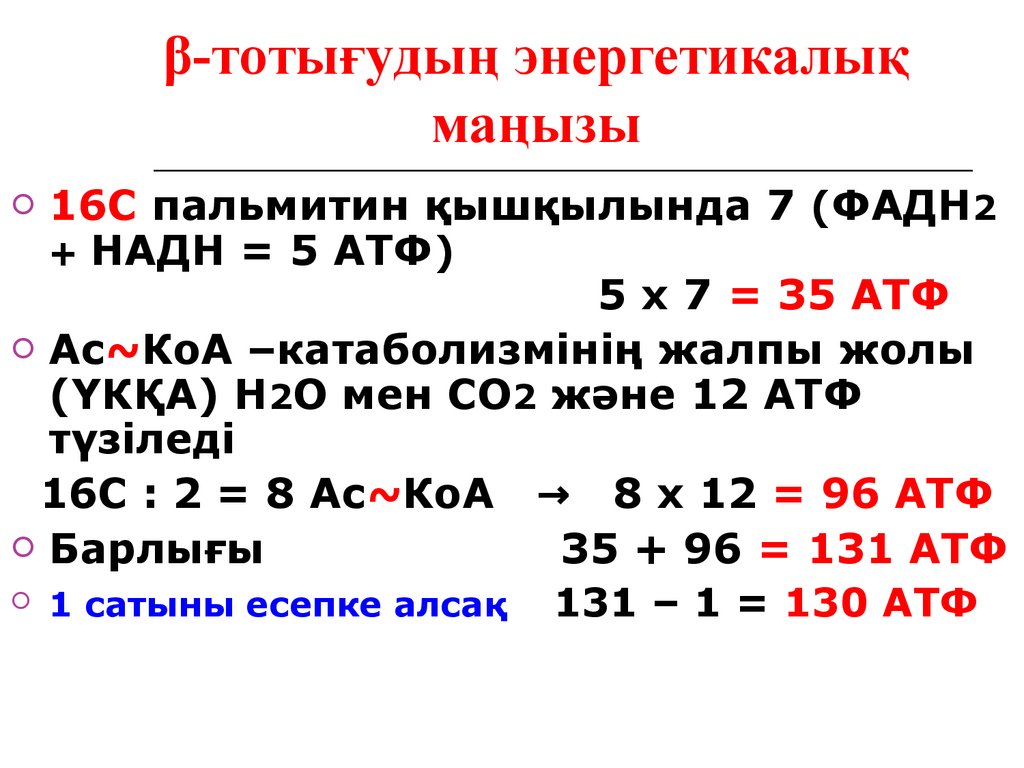 16С пальмитин қышқылында 7 (ФАДН2+ НАДН = 5 АТФ)