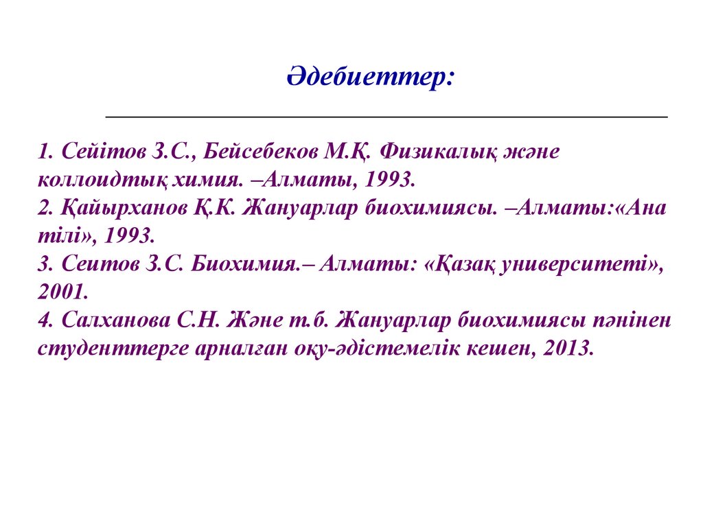 31. 1. Сейітов З.С., Бейсебеков М.Қ. Физикалық және коллоидтық химия. –Алматы, 1993. 2. Қайырханов Қ.К. Жануарлар биохимиясы.