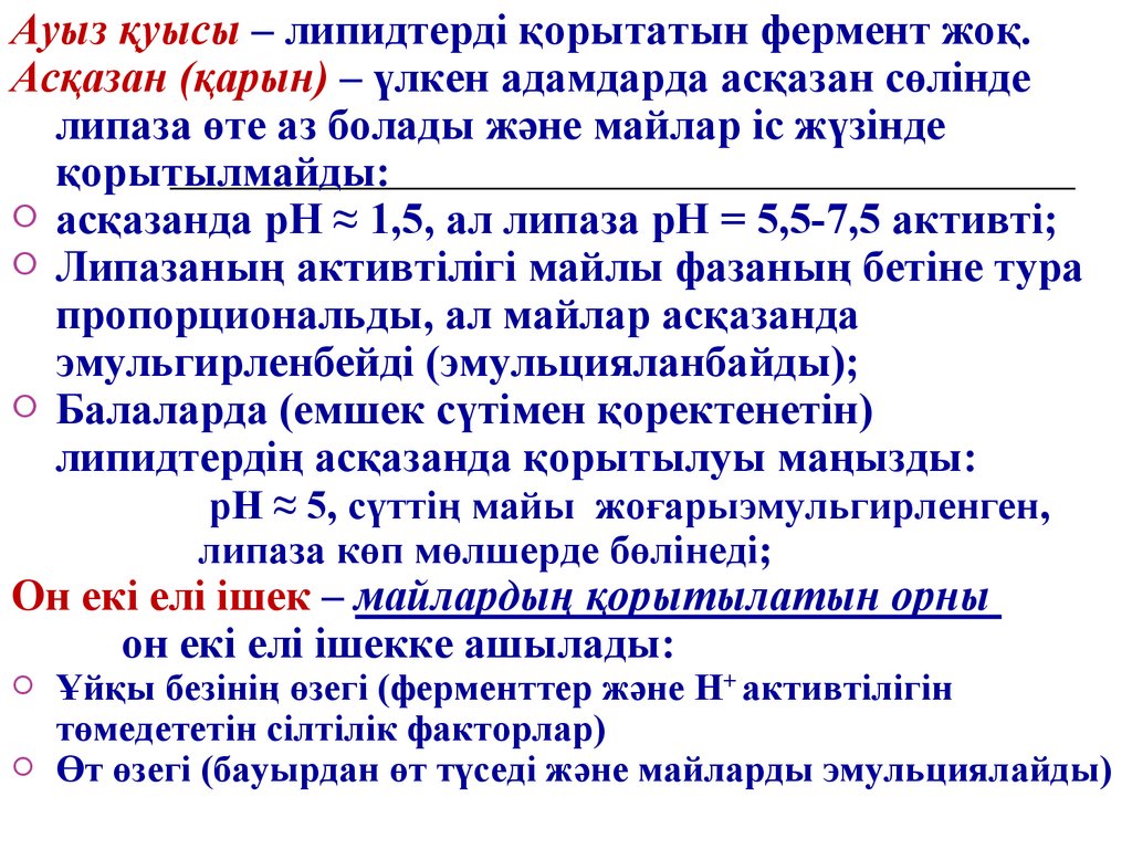 Ауыз қуысы – липидтерді қорытатын фермент жоқ.Асқазан (қарын) – үлкен адамдарда асқазан сөлінде