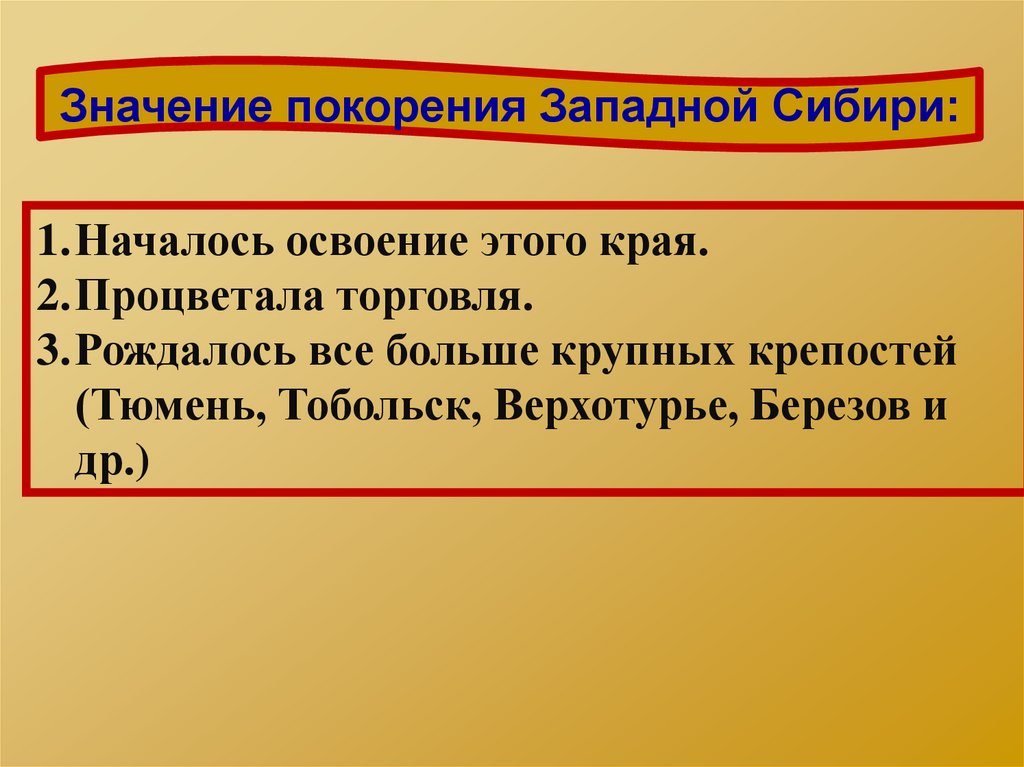 Значение покорения Западной Сибири:1.Началось освоение этого края.