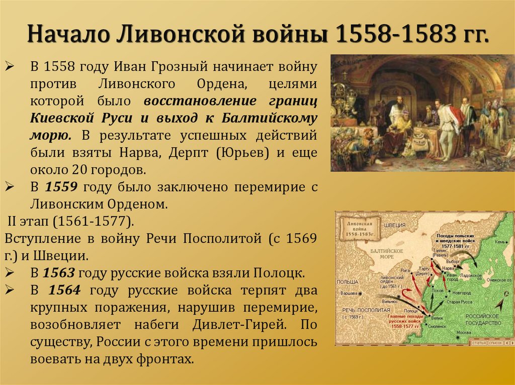 Начало Ливонской войны 1558-1583 гг.В 1558 году Иван Грозный начинает войну