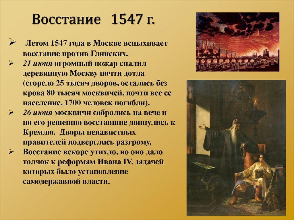 Восстание 1547 г.Летом 1547 года в Москве вспыхивает
