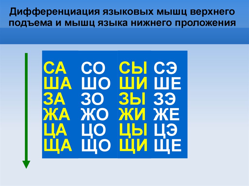 Дифференциация языковых мышц отпереднеязычного положения к заднеязычному