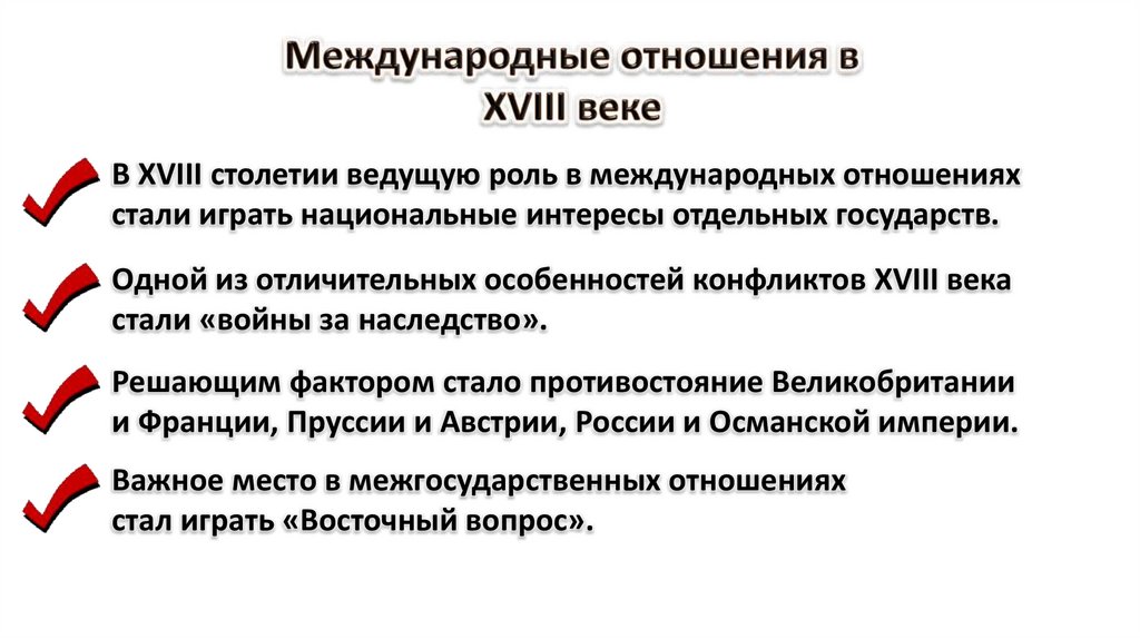 В XVIII столетии ведущую роль в международных отношенияхстали играть национальные интересы отдельных государств.