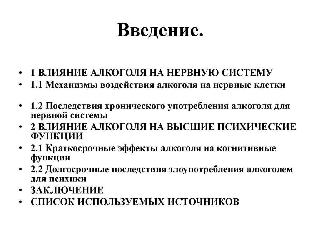 Введение.• 1 ВЛИЯНИЕ АЛКОГОЛЯ НА НЕРВНУЮ СИСТЕМУ
