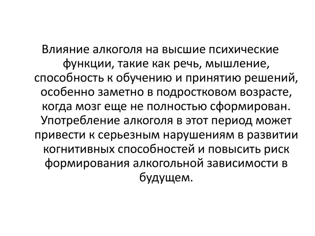 Влияние алкоголя на высшие психическиефункции, такие как речь, мышление,