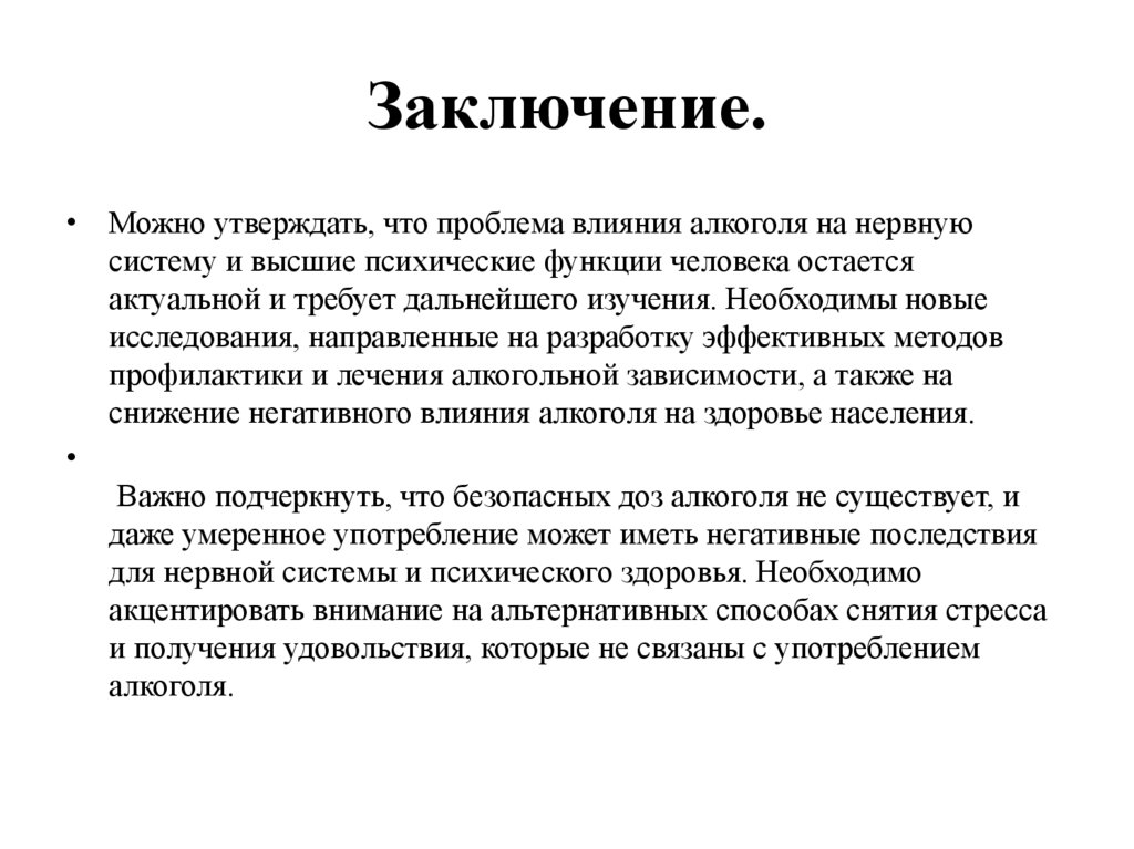 Заключение.• Можно утверждать, что проблема влияния алкоголя на нервную