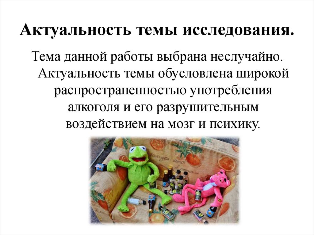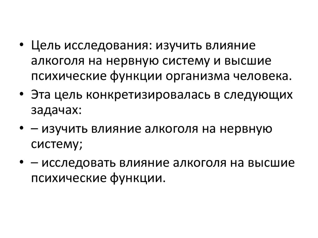 • Цель исследования: изучить влияниеалкоголя на нервную систему и высшие