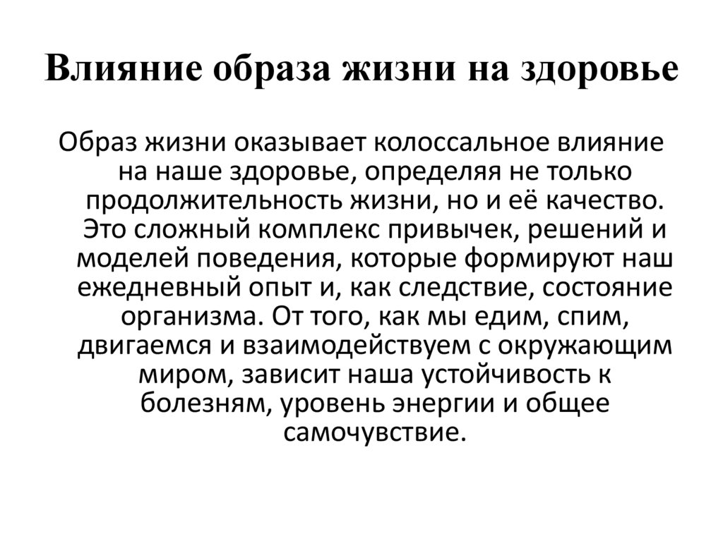 Влияние образа жизни на здоровьеОбраз жизни оказывает колоссальное влияние