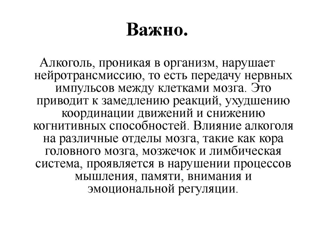Важно.Алкоголь, проникая в организм, нарушает