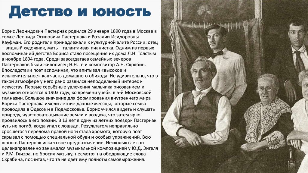 Детство и юностьБорис Леонидович Пастернак родился 29 января 1890 года в Москве в