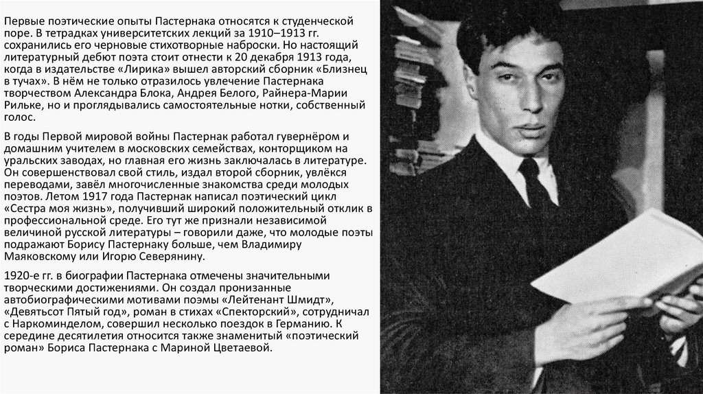 Первые поэтические опыты Пастернака относятся к студенческойпоре. В тетрадках университетских лекций за 1910–1913 гг.
