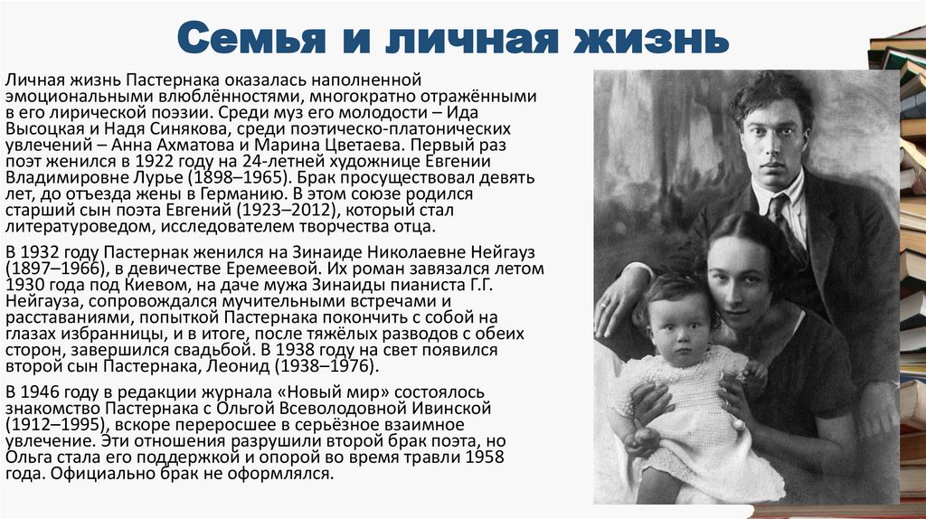 Семья и личная жизньЛичная жизнь Пастернака оказалась наполненной