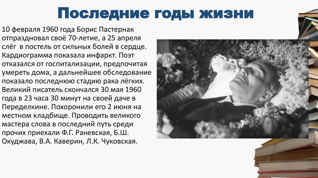 Последние годы жизни10 февраля 1960 года Борис Пастернак