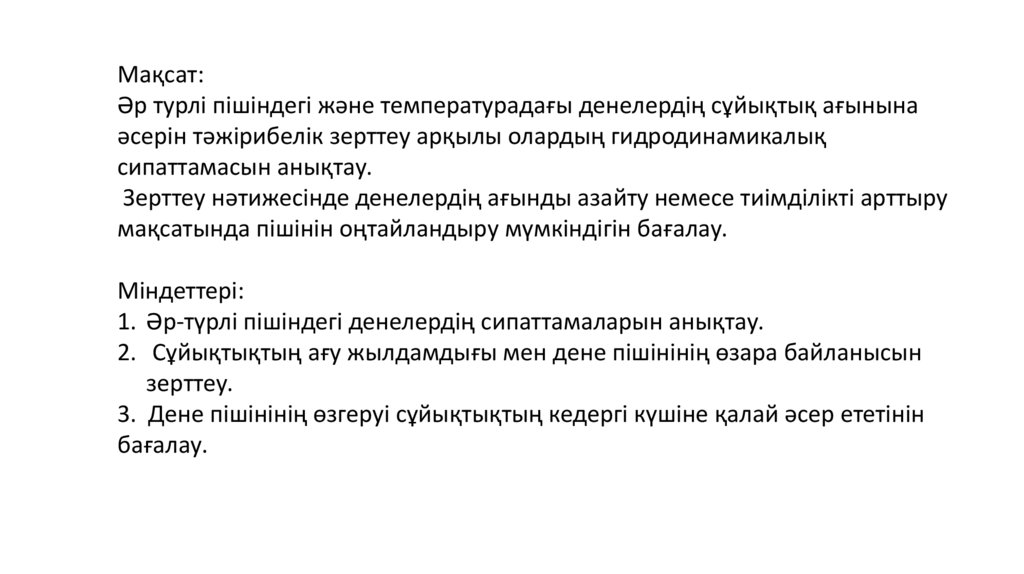 Мақсат:Әр турлі пішіндегі және температурадағы денелердің сұйықтық ағынына