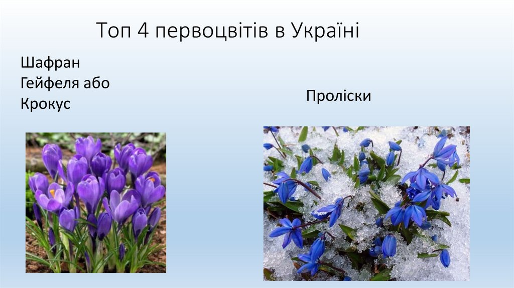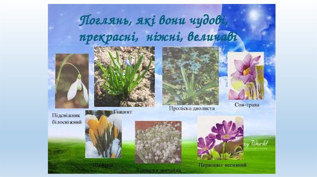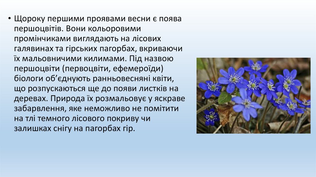 • Щороку першими проявами весни є появапершоцвітів. Вони кольоровими