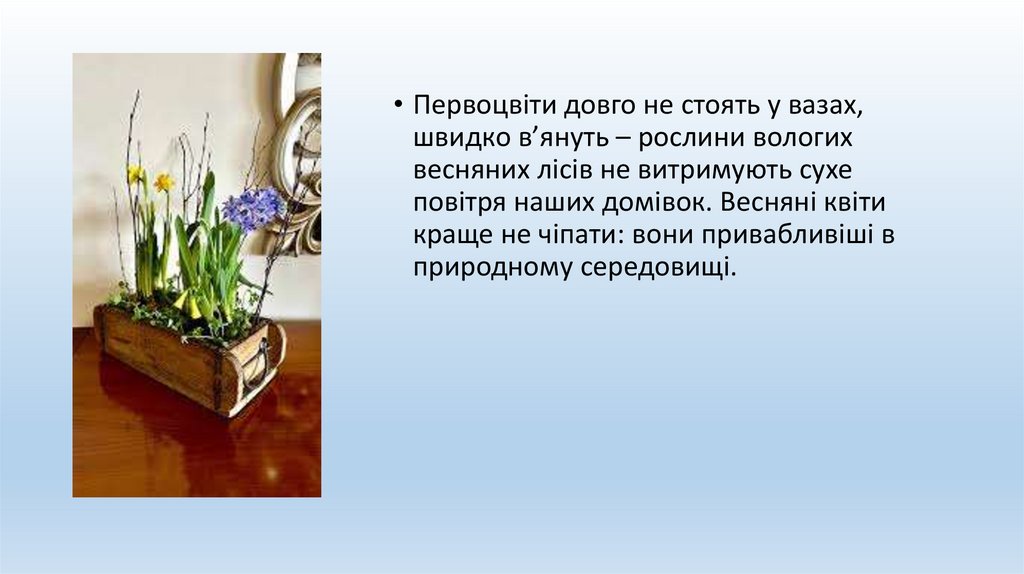 • Первоцвіти довго не стоять у вазах,швидко в’януть – рослини вологих