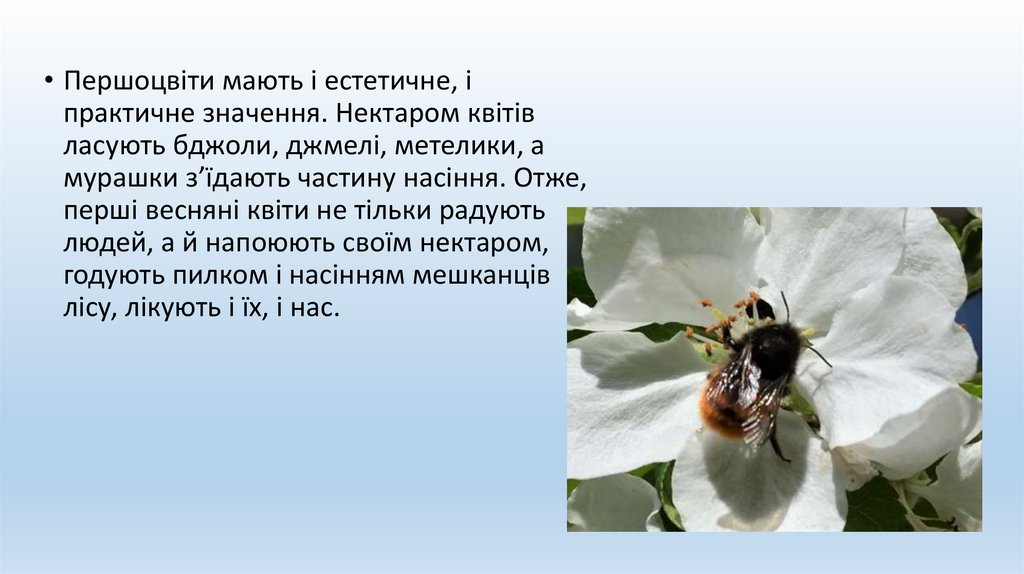 • Першоцвіти мають і естетичне, іпрактичне значення. Нектаром квітів