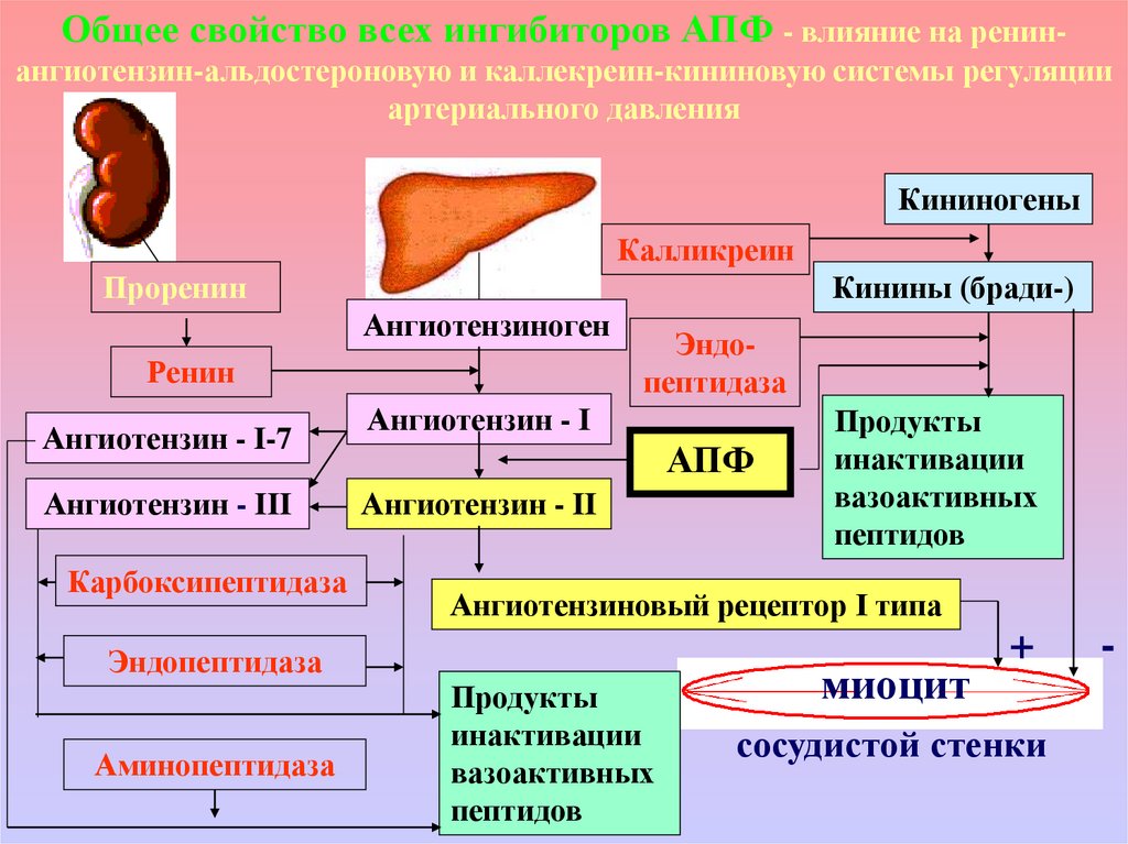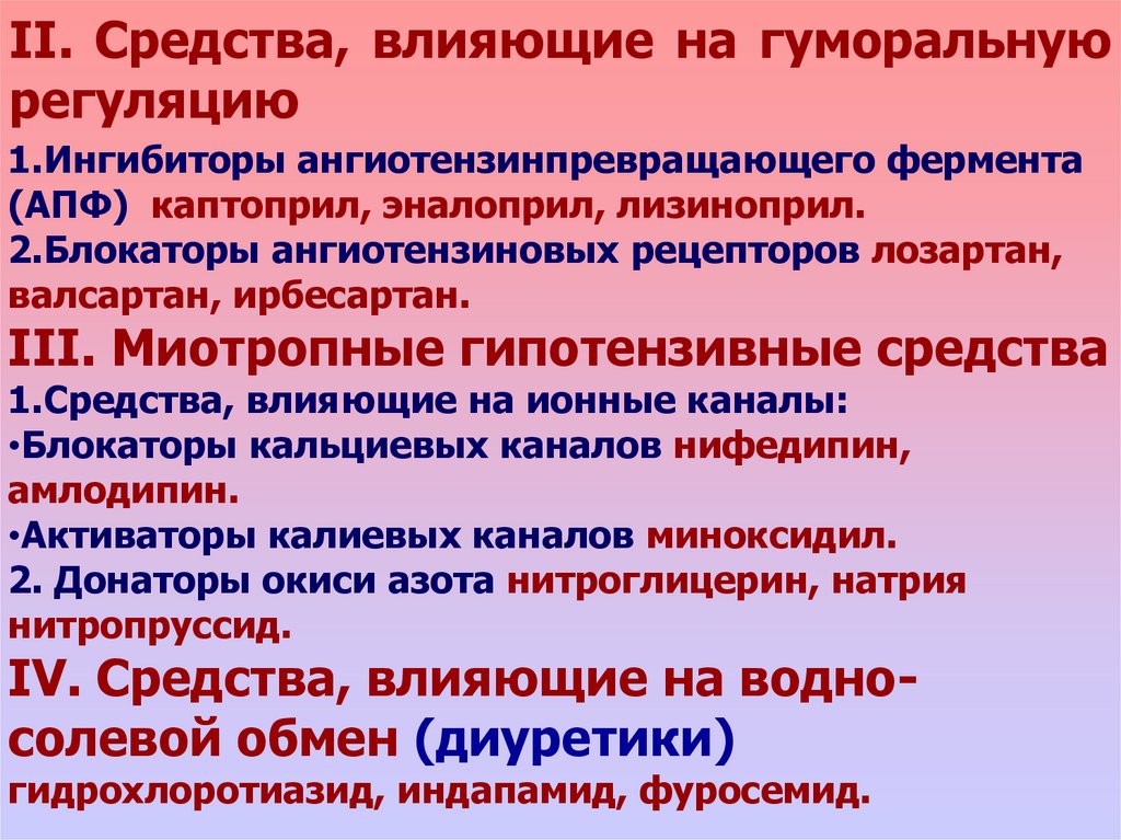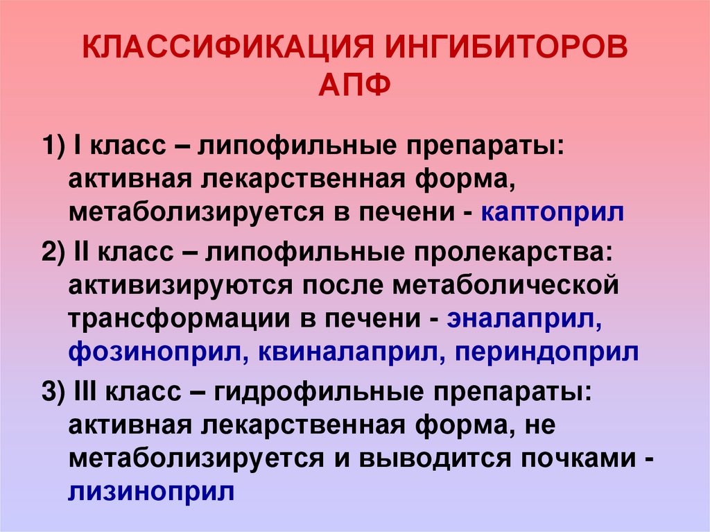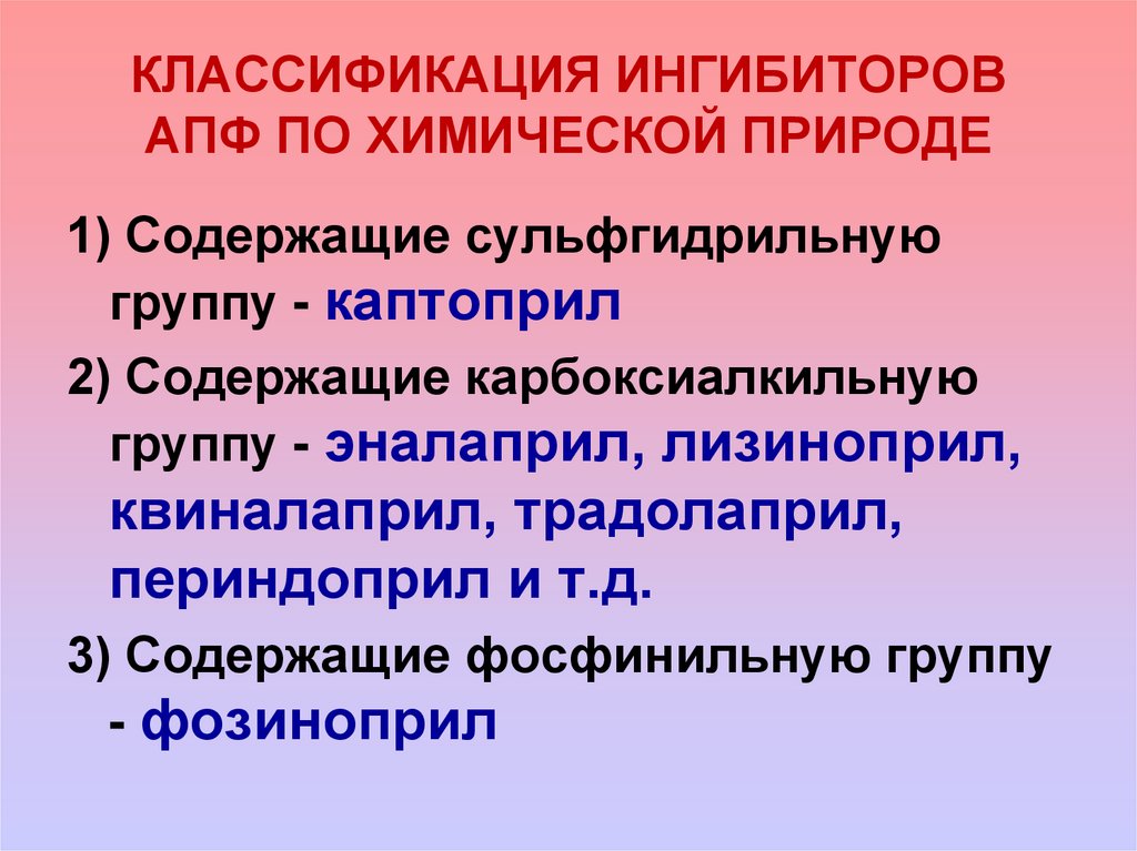1.Ингибиторы ангиотензинпревращающего фермента(АПФ) каптоприл, эналоприл, лизиноприл.