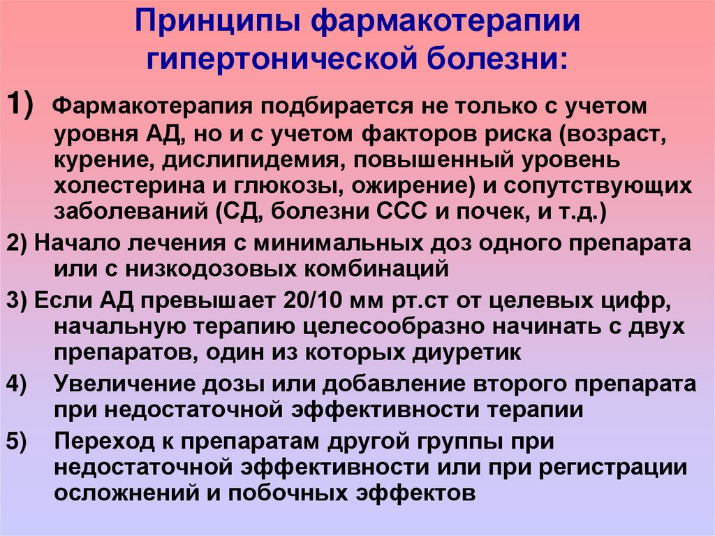 1) Фармакотерапия подбирается не только с учетомуровня АД, но и с учетом факторов риска (возраст,