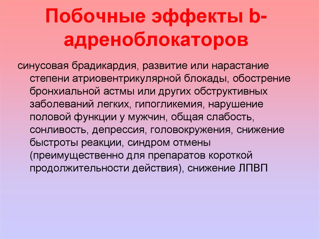 Побочные эффекты bадреноблокаторовсинусовая брадикардия, развитие или нарастание