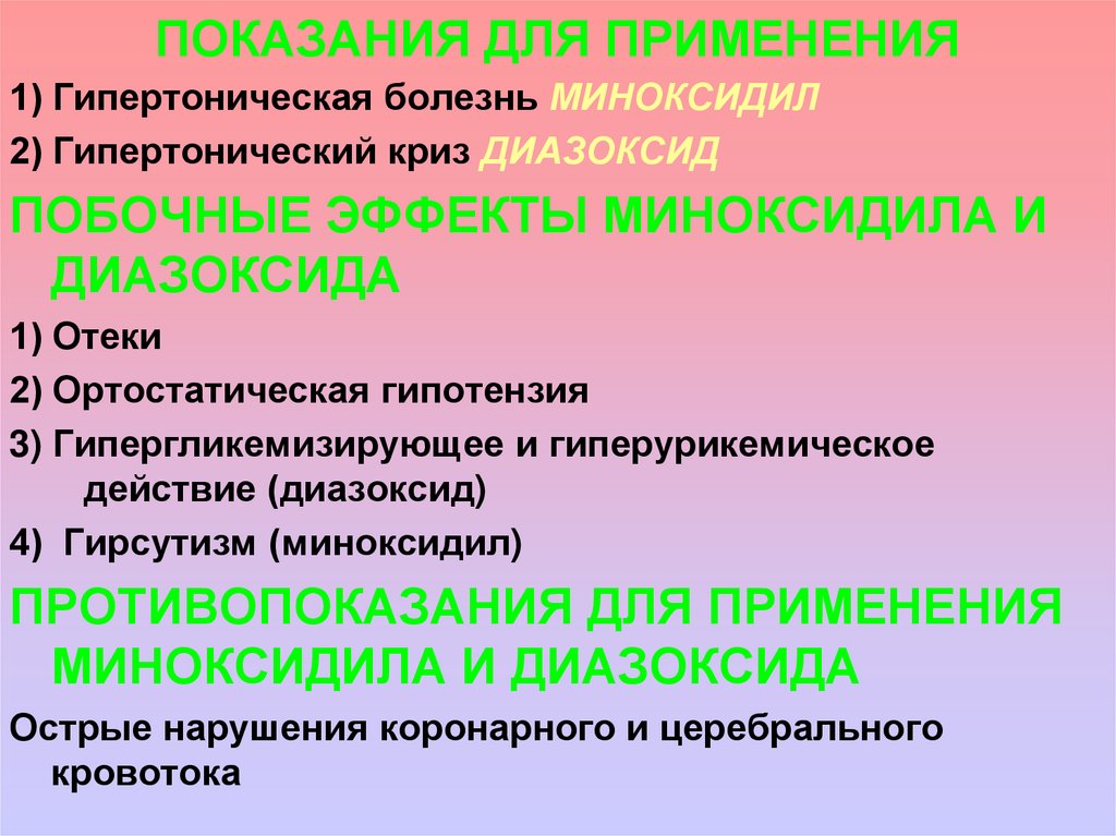 1) Гипертоническая болезнь МИНОКСИДИЛ2) Гипертонический криз ДИАЗОКСИД