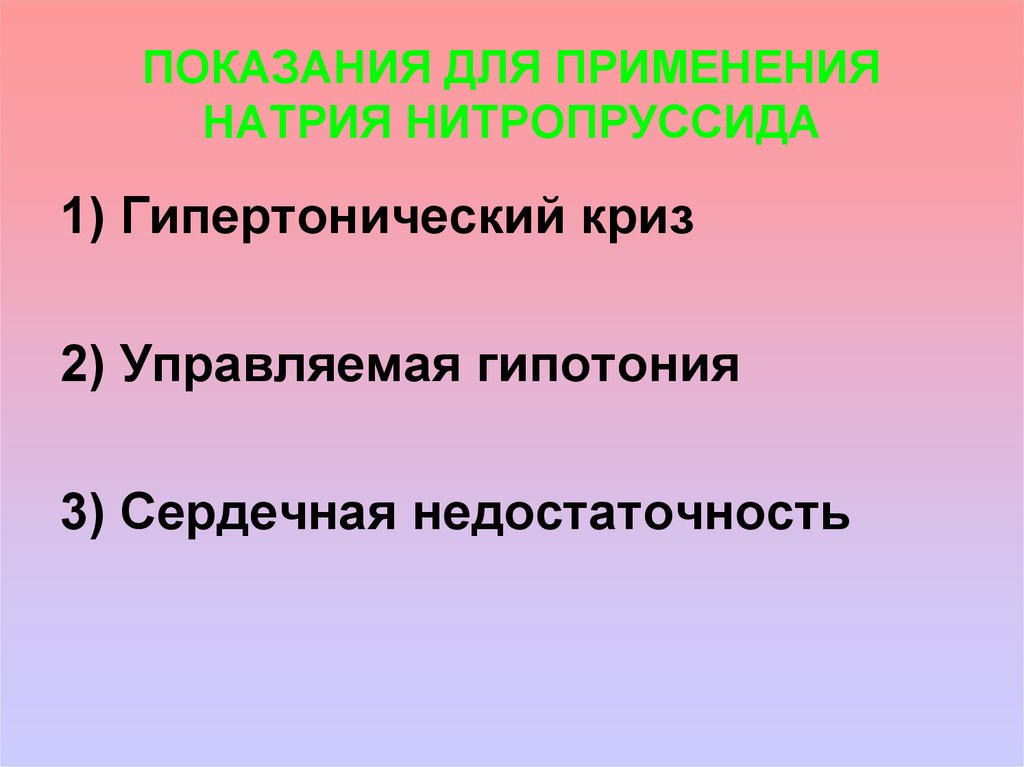 41. ПОКАЗАНИЯ ДЛЯ ПРИМЕНЕНИЯ НАТРИЯ НИТРОПРУССИДА