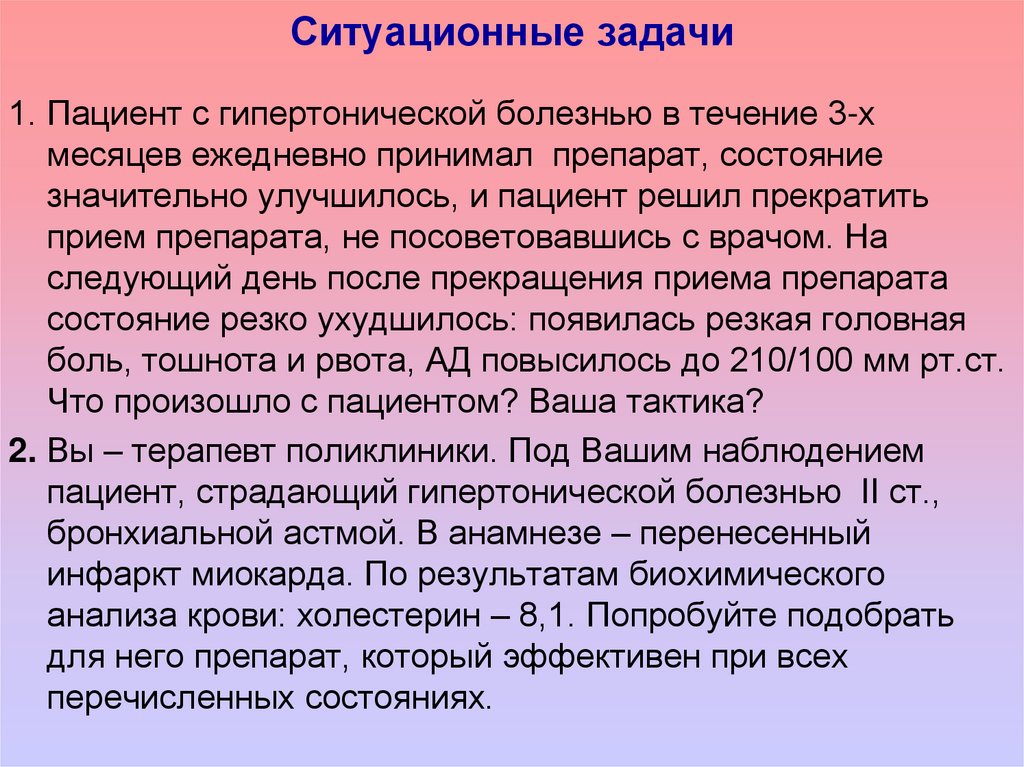 1. Пациент с гипертонической болезнью в течение 3-хмесяцев ежедневно принимал препарат, состояние