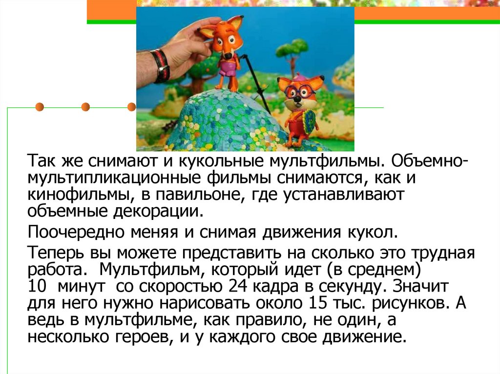 Так же снимают и кукольные мультфильмы. Объемномультипликационные фильмы снимаются, как икинофильмы, в павильоне, где устанавливают
