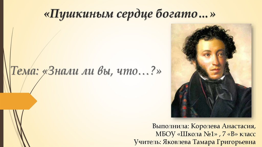 «Пушкиным сердце богато…»Тема: «Знали ли вы, что…?»