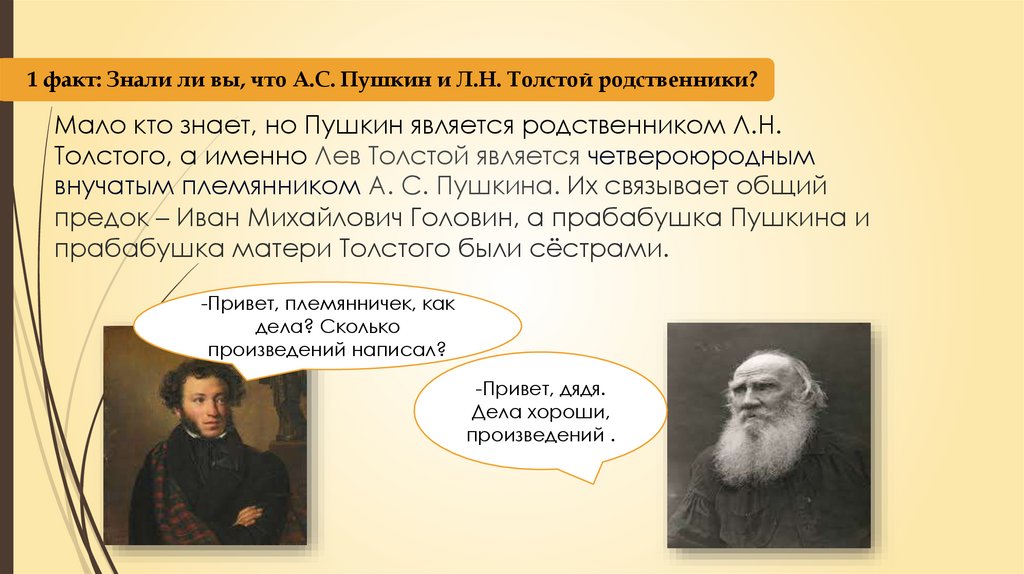 1 факт: Знали ли вы, что А.С. Пушкин и Л.Н. Толстой родственники?Мало кто знает, но Пушкин является родственником Л.Н.