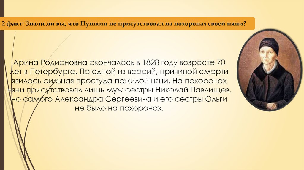 2 факт: Знали ли вы, что Пушкин не присутствовал на похоронах своей няни?Арина Родионовна скончалась в 1828 году возрасте 70