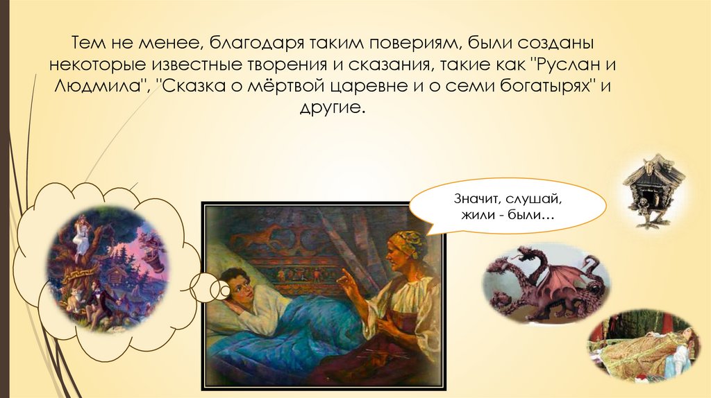 Тем не менее, благодаря таким повериям, были созданынекоторые известные творения и сказания, такие как "Руслан и