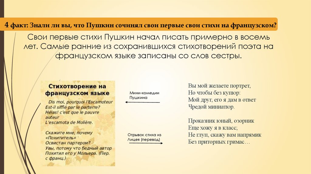 4 факт: Знали ли вы, что Пушкин сочинял свои первые свои стихи на французском?Свои первые стихи Пушкин начал писать примерно в восемь