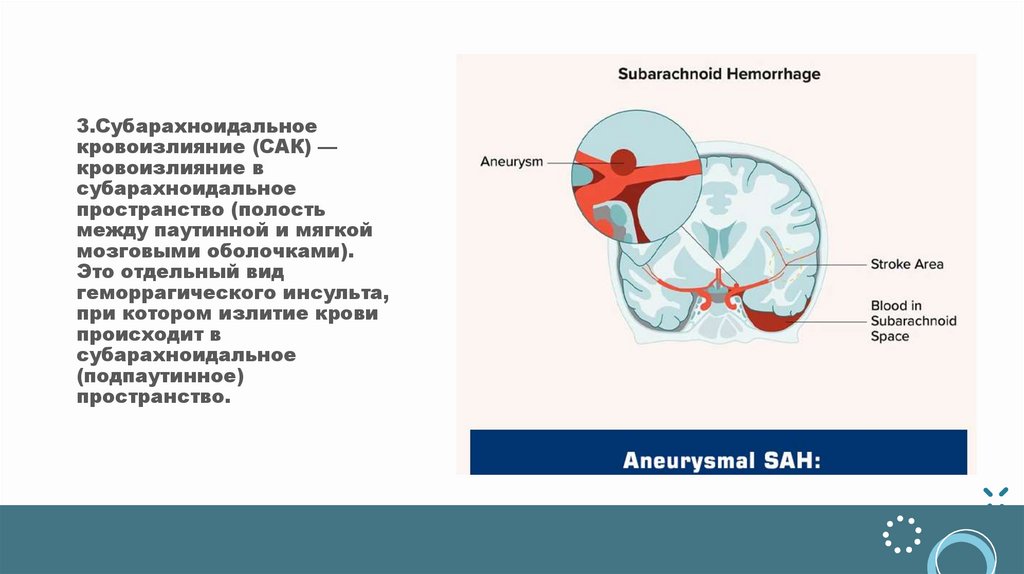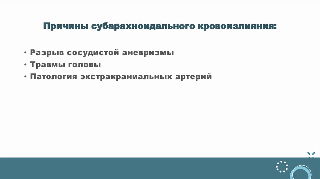 Причины субарахноидального кровоизлияния:• Разрыв сосудистой аневризмы