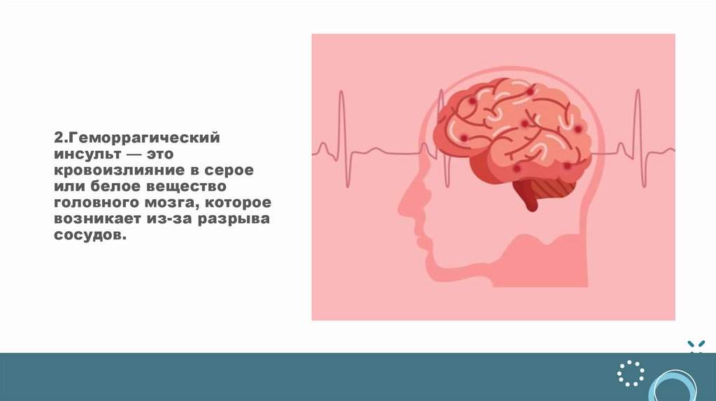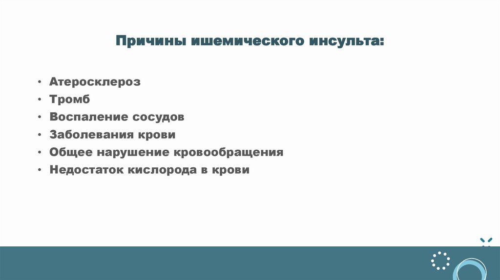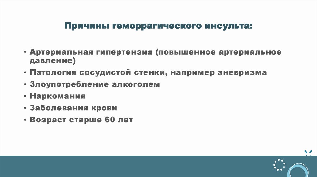 Причины геморрагического инсульта:• Артериальная гипертензия (повышенное артериальное