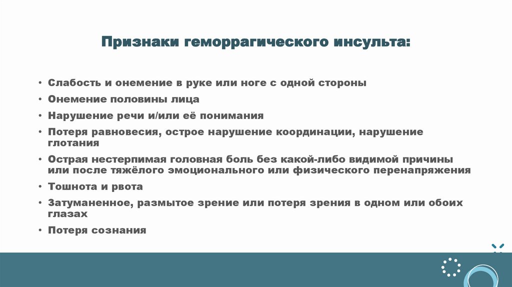 Признаки геморрагического инсульта:• Слабость и онемение в руке или ноге с одной стороны
