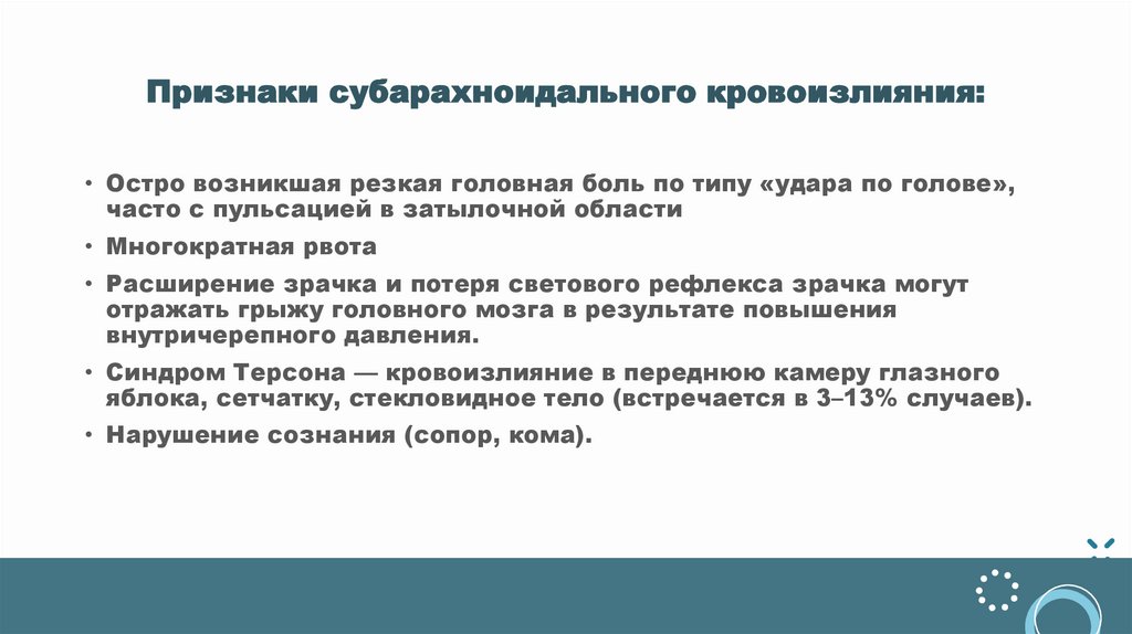 Признаки субарахноидального кровоизлияния:• Остро возникшая резкая головная боль по типу «удара по голове»,