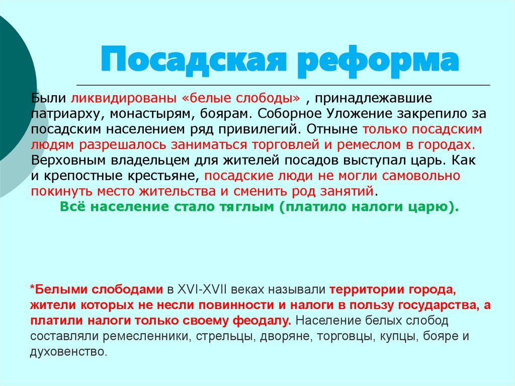 Посадская реформаБыли ликвидированы «белые слободы» , принадлежавшие