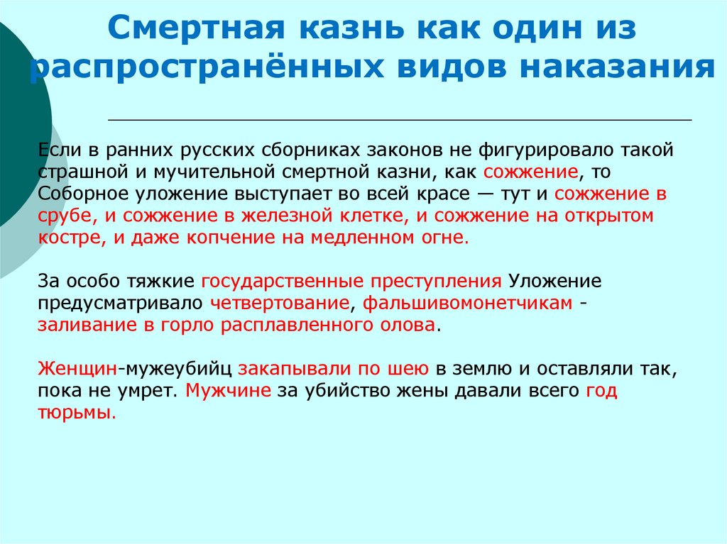 предусматривало четвертование, фальшивомонетчикам заливание в горло расплавленного олова.