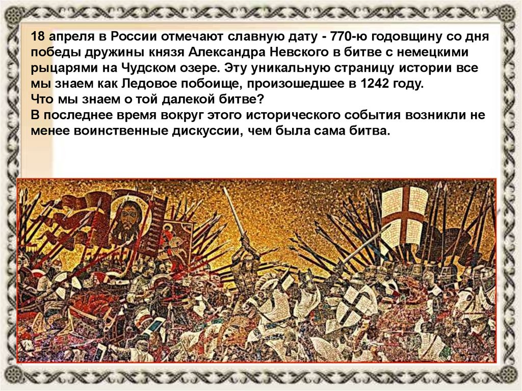 18 апреля в России отмечают славную дату - 770-ю годовщину со дняпобеды дружины князя Александра Невского в битве с немецкими